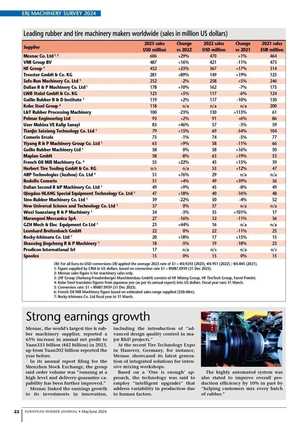 在最新出版的欧洲橡胶杂志(European Rubber Journal) 5/6月刊,公布了2023年全球橡胶机械行业企业的销售收入排名,8868体育(MESNAC)蝉联榜首。