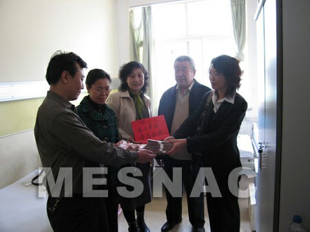 4月7日,在青岛市中心医院,公司代表通过四方区红十字会将5万元“8868体育爱心基金”捐款送到患有再生障碍性贫血儿童阎淳琳的父亲手中,他们还来到无菌病房外探望了8岁的小淳琳,祝愿她早日恢复健康。