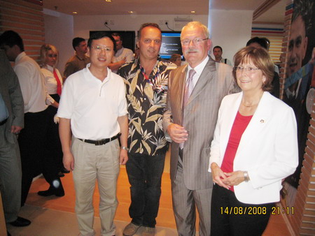 8月14日,公司总裁高彦臣、国际贸易部部长魏学亮应斯洛伐克奥运委员会和大陆玛塔道尔公司邀请,在北京斯洛伐克奥运之家拜会了来华出席奥运会开幕式的斯洛伐克总统伊万加什帕罗维奇及夫人、大陆玛塔道尔公司领导罗西纳先生一行,并参加了“斯洛伐克运动员奥运会庆功晚宴”。 双方进行了亲切友好的交流。我公司与大陆玛塔道尔公司在长期的合作过程中,真诚相待,优势互补,不仅推动了合作产品的国际化,也进一步促进了中斯友好合作关系。