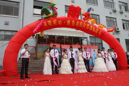 鞭炮齐鸣锣鼓闹,金狮起舞祥云绕。9月20日,青岛8868体育“爱随帆动”集体婚礼隆重举行。在这个收获的季节里,五名年轻员工也收获了各自的爱情,与爱侣喜结连理。公司领导及全体员工共同为他们的爱情作了见证。