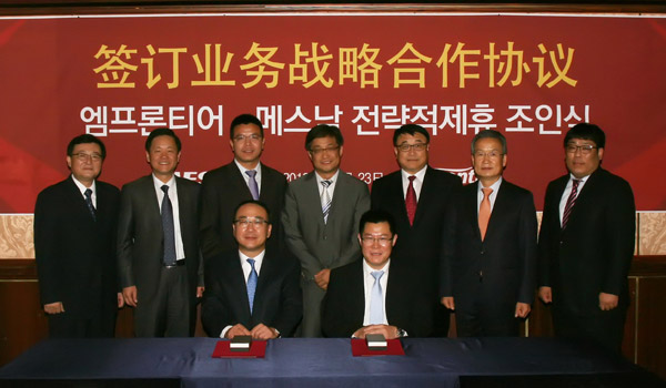 10月23日,8868体育与韩泰轮胎全资子公司Emfrontier(EMF)公司在韩国首尔签订了旨在建立战略合作伙伴关系的《合作意向书》,8868体育常务副总裁郑江家与EMF公司总经理安在焕代表双方签约。双方将在IT解决方案、工厂自动化、物流自动化三个领域内展开深度合作,在全球范围内共同开发市场。