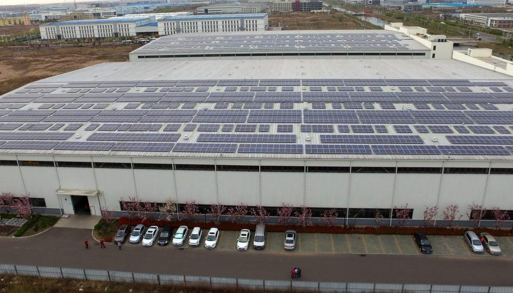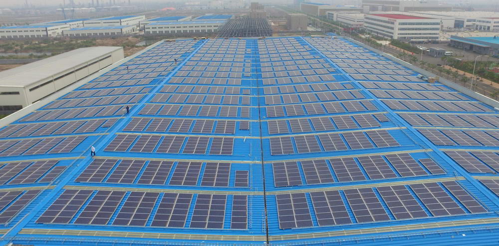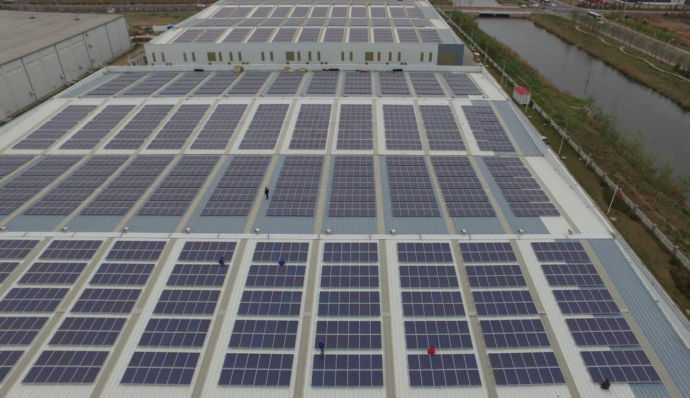 借此机会,青岛华控能源牵手青岛高新区内的科捷机器人和佳友机械厂,在其房屋顶建设了光伏发电项目作为试点。一块块一人多高的矩形太阳能板均匀的排列在厂房屋顶,十分规整,科技感十足,这就是光伏发电装置。太阳能板平铺在厂房屋顶既节约了空间,同时也可以让太阳能板充分接受阳光照射。