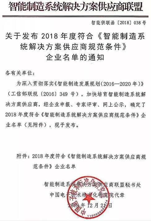 为加强智能制造系统解决方案供应商管理,深入贯彻落实《智能制造发展规划(2016—2020年)》(工信部联规〔2016〕349号),中国智能制造系统解决方案供应商联盟组织开展符合《智能制造系统解决方案供应商规范条件》的企业申报工作,经专业评审、网上公示,最终全国范围共评选出82家知名企业,山东省共8家企业入选。