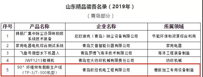近日,山东省工业和信息化厅发布了《山东精品装备名录(2019年)》,8868体育90°纤维帘布裁断生产线(TP-3/T-300机型)成功入选“山东精品装备”行列。