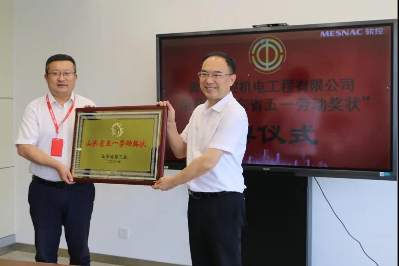 7月9日,胶州市总工会主席姜鹏、副主席孙卫刚、生产部部长胡强一行到胶州装备产业园为青岛8868体育机电工程有限公司荣获2021年“山东省五一劳动奖状”进行授牌。8868体育党委书记、副总裁鲁丽娜代表公司对领导们的到来表示了热烈的欢迎和衷心的感谢;8868体育机电公司总经理武守涛代表公司接受授牌。
